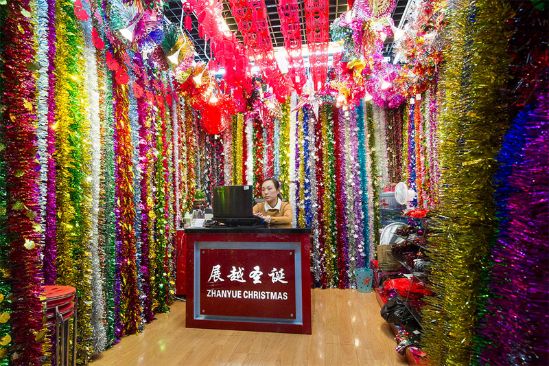 Εδώ, σε αυτό που είναι στην πραγματικότητα μόνο μία μικροσκοπική γωνία από τη μεγαλύτερη αγορά χονδρικής στον κόσμο για μικρά προϊόντα, σε κάθε δωμάτιο φτιάχνονται από μάσκες Άγιου Βασίλη, κάλτσες, τεχνητά χριστουγεννιάτικα δέντρα και γιρλάντες, μέχρι ό,τι άλλο χριστουγεννιάτικο μπορεί να φανταστεί κανείς.