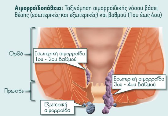 Οι αιμορροΐδες μπορεί να βρίσκονται στο εσωτερικό του ορθού (εσωτερικές αιμορροΐδες), ή μπορούν να αναπτυχθούν κάτω από το δέρμα και γύρω από τον πρωκτό (εξωτερικές αιμορροΐδες).