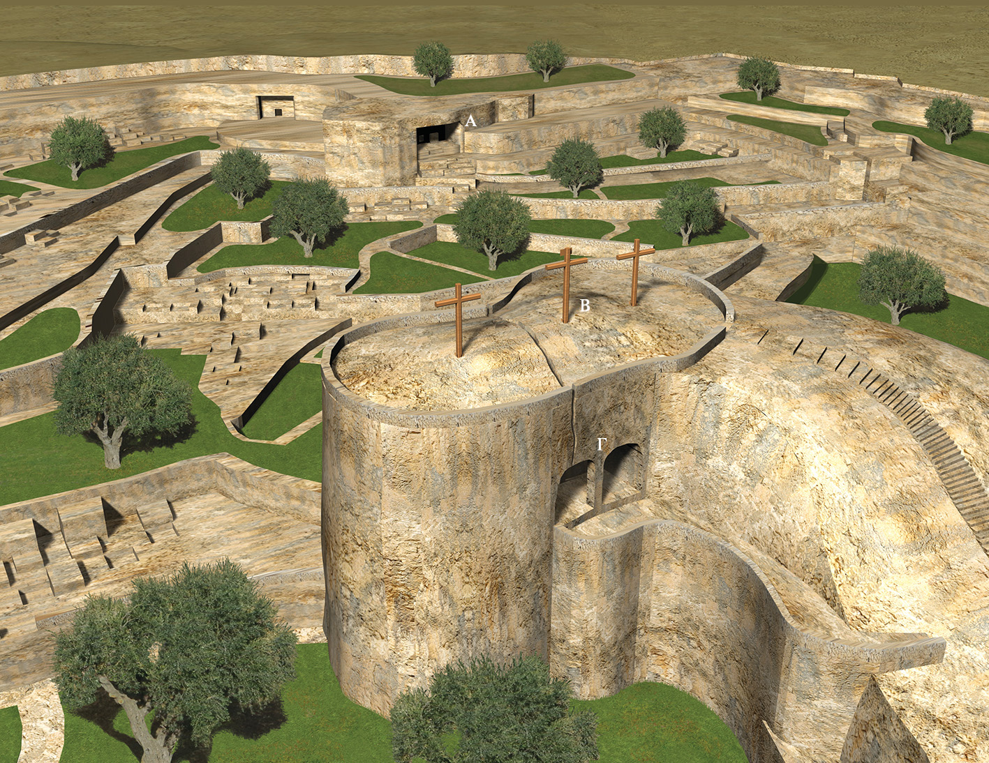 Στο βάθος, στο σημείο Α, βρίσκεται ο Τάφος του Χριστού, σε απόσταση 45 μέτρων από το σημείο της Σταύρωσης (σημείο Β). Στο σημείο Γ βρίσκεται η διπλή σπηλιά που ανακαλύφθηκε στην ανασκαφή του 1977, η οποία σύμφωνα με τον Ισπανό αρχαιολόγο Fernandez Diez είχε μετατραπεί σε τόπο λατρείας του Χριστού κατά τον 1ο αιώνα. O τόπος της Σταύρωσης ήταν οριοθετημένος με έναν πέτρινο περίβολο, τον οποίο αποδώσαμε υποθετικά με διαστάσεις 16 Χ 8 μέτρα. Οι κάτοικοι της πόλης έβλεπαν τον Εσταυρωμένο από απόσταση, ευρισκόμενοι περιμετρικά του λατομείου. Οι γνωστοί του Ιησού, όπως γράφει ο ευαγγελιστής Λουκάς, «εστέκοντο και έβλεπαν από μακρυά» (Λουκάς 23, 49).