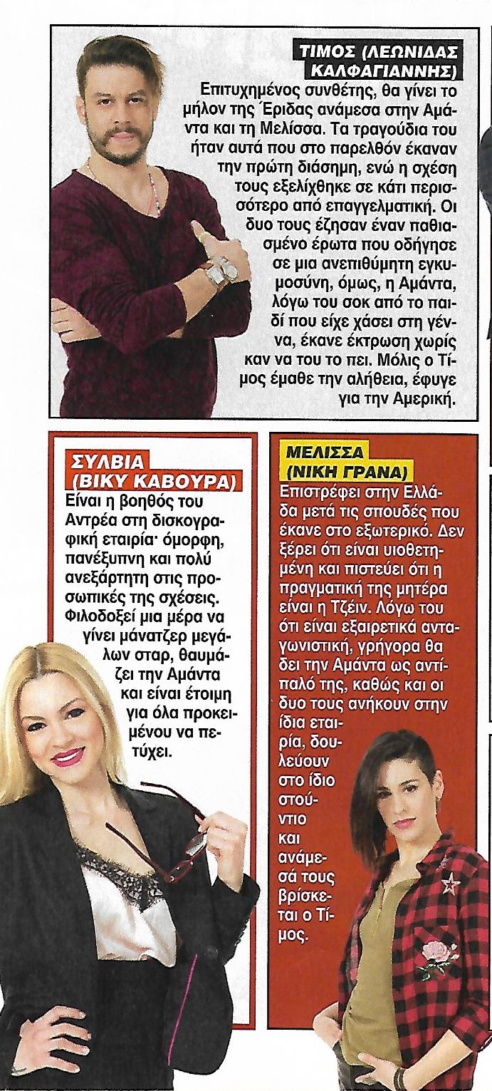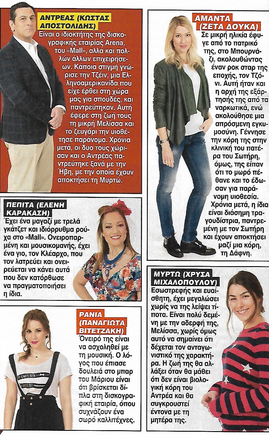Η Μελίσα δεν υποψιάζεται ότι στην πραγματικότητα είναι υιοθετημένη από τον Αντρέα (Κώστας Αποστολίδης), ιδιοκτήτη δισκογραφικής εταιρίας και την πρώτη του σύζυγο, Jane (Τάνια Τρύπη). Ζει μαζί του και με τη δεύτερη γυναίκα του, την Ήβη (Ελισάβετ Μουτάφη) και την κόρη τους, Μυρτώ (Χρύσα Μιχαλοπούλου). Ο έρωτας της για τον Τίμο, έναν γοητευτικό συνθέτη – στιχουργό, θα τη μεταμορφώσει και θα γίνει σκοπός της ζωής της. Η Αμάντα ζει με τον γιατρό σύζυγό της Σωτήρη (Χάρης Κκολός) σε έναν βαλτωμένο γάμο. Μαζί έχουν αποκτήσει μια κόρη, τη Δάφνη (Μαρτίνα Δημοπούλου). Όταν γνωρίζει τον Τίμο, τον ερωτεύεται παράφορα. Αρένα – Επεισόδια, υπόθεση, ηθοποιοί star