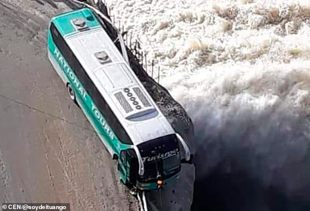 Το πλάνο λήφθηκε από θεατή και δείχνει το μπροστινό μέρος του συντριμμένου λεωφορείου με τα ύδατα που ρέουν ισχυρά κάτω.