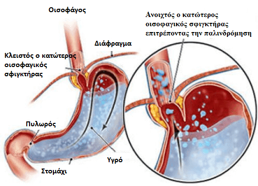 Στη συμβολή μεταξύ οισοφάγου με το στομάχι μας υπάρχει ένας μυϊκός σφιγκτήρας (κατώτερος οισοφαγικός σφιγκτήρας), ο οποίος επιτρέπει τη διέλευση τροφής από τον οισοφάγο στο στομάχι αλλά παρεμποδίζει την παλινδρόμηση της τροφής από το στομάχι στον οισοφάγο.