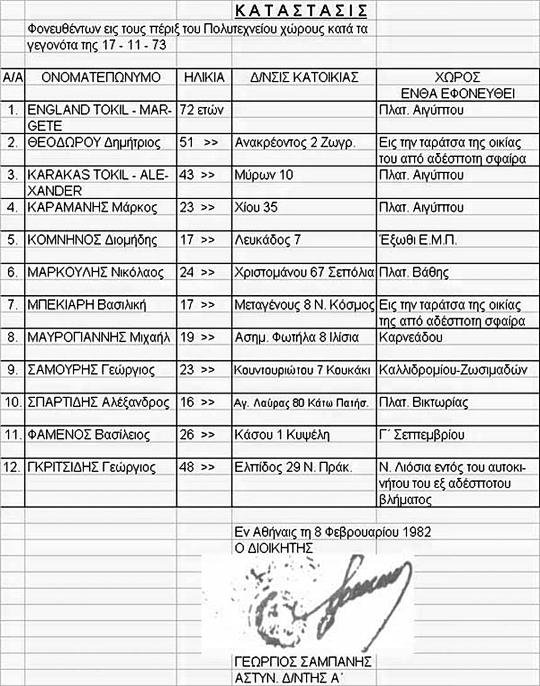 12. Στυλιανός Αγαμ. Καραγεώργης, ετών 19, εργάτης. Ετραυματίσθη θανασίμως επί της οδού Πατησίων, έμπροσθεν του κινηματογράφου ΕΛΛΗΝΙΣ, περί ώρα 10.00′ της 17.11.1973, βληθείς εκ διερχομένου άρματος και απεβίωσεν εις το ΚΑΤ την 30.11.1973.