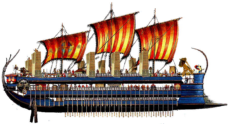 - Στο ανώτερο κατάστρωμα ήταν τοποθετημένες πολεμικές μηχανές (καταπέλτες, βαλλίστρες, χελώνες, πύργοι, άγκιστρα κ.ά.) και εφρουρείτο από ισχυρό σώμα στρατιωτών.