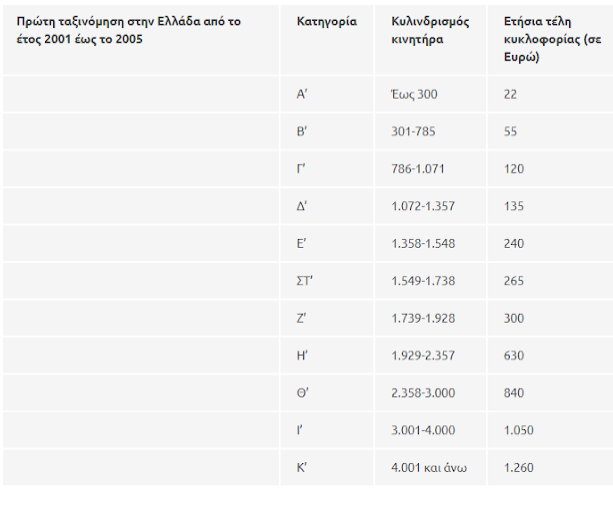 α) Επιβατικά αυτοκίνητα ταξινομημένα για πρώτη φορά στην Ελλάδα μέχρι τις 31.10.2010 και μοτοσικλέτες με δύο μοτοσυκλέτες ανεξάρτητα από την ημερομηνία ταξινόμησής τους στην Ελλάδα , βάσει του κυλίνδρου του κινητήρα τους, ως εξής: